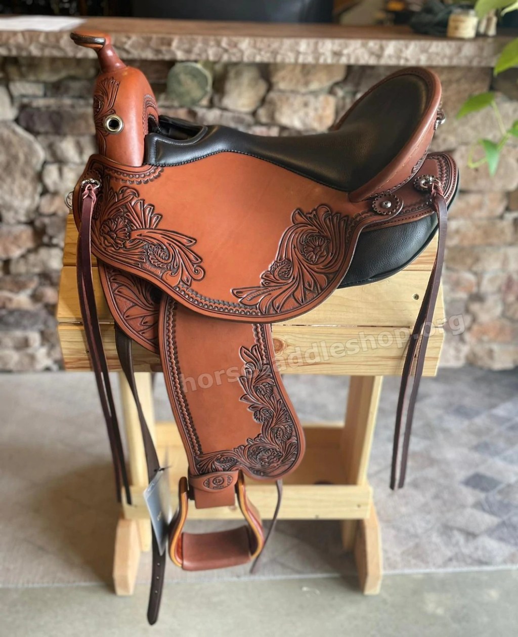 A ranch saddle has a low seat with high cantle, which means it’s usually made out of soft leather or synthetic material (like nylon). It may have two horn plates on each side of its front (either one or two), which help keep you from slipping when you’re roping or riding bareback through deep water. The back is usually higher than other types of saddles because it’s meant for carrying things like buckets of water or grain sacks onto your horse after being ridden across rough terrain during trail rides at ranches all over America today!